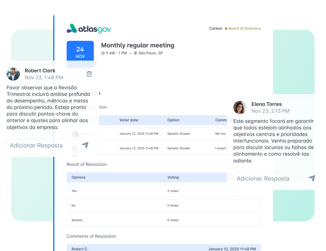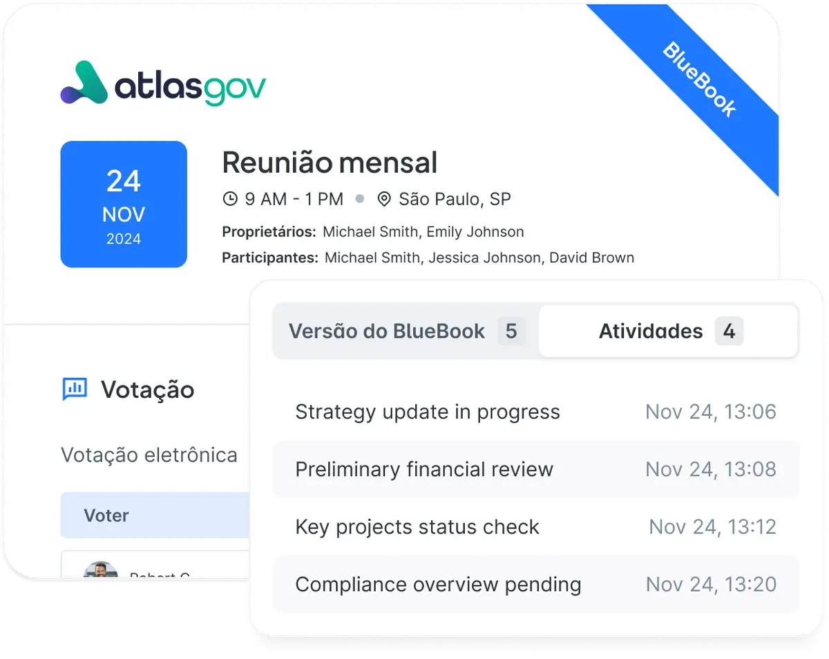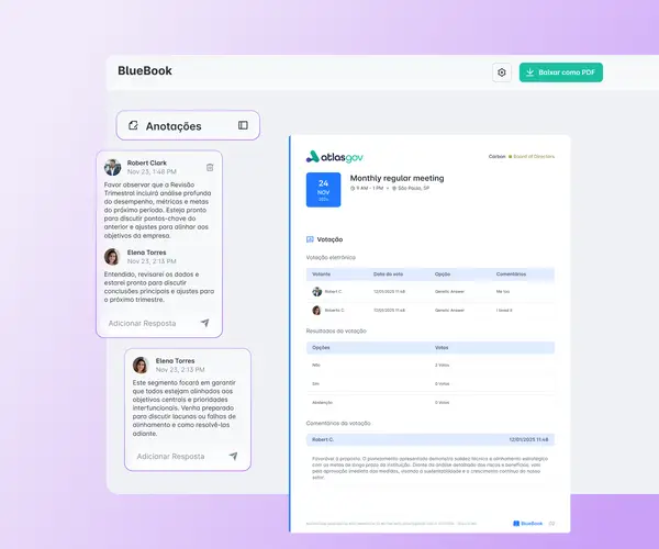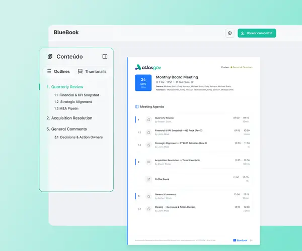 O Atlas Bluebook reúne sua pauta e anexos em um documento organizado, com índice automático, marca d'água personalizada e registro de acesso. Entre em cada reunião sabendo que nada ficou de fora e ninguém pode dizer que não recebeu os materiais.